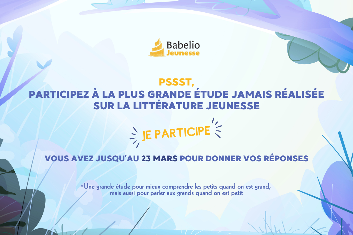 Jusqu'au 23 mars, Babelio lance la plus grande étude jamais réalisée sur la littérature jeunesse ! Vous faites partis de la communauté de Babelio ou êtes lecteurs ? En quelques clics, venez partager vos avis, vos habitudes et vos préférences en lectures et/ou achats de livres jeunesse.