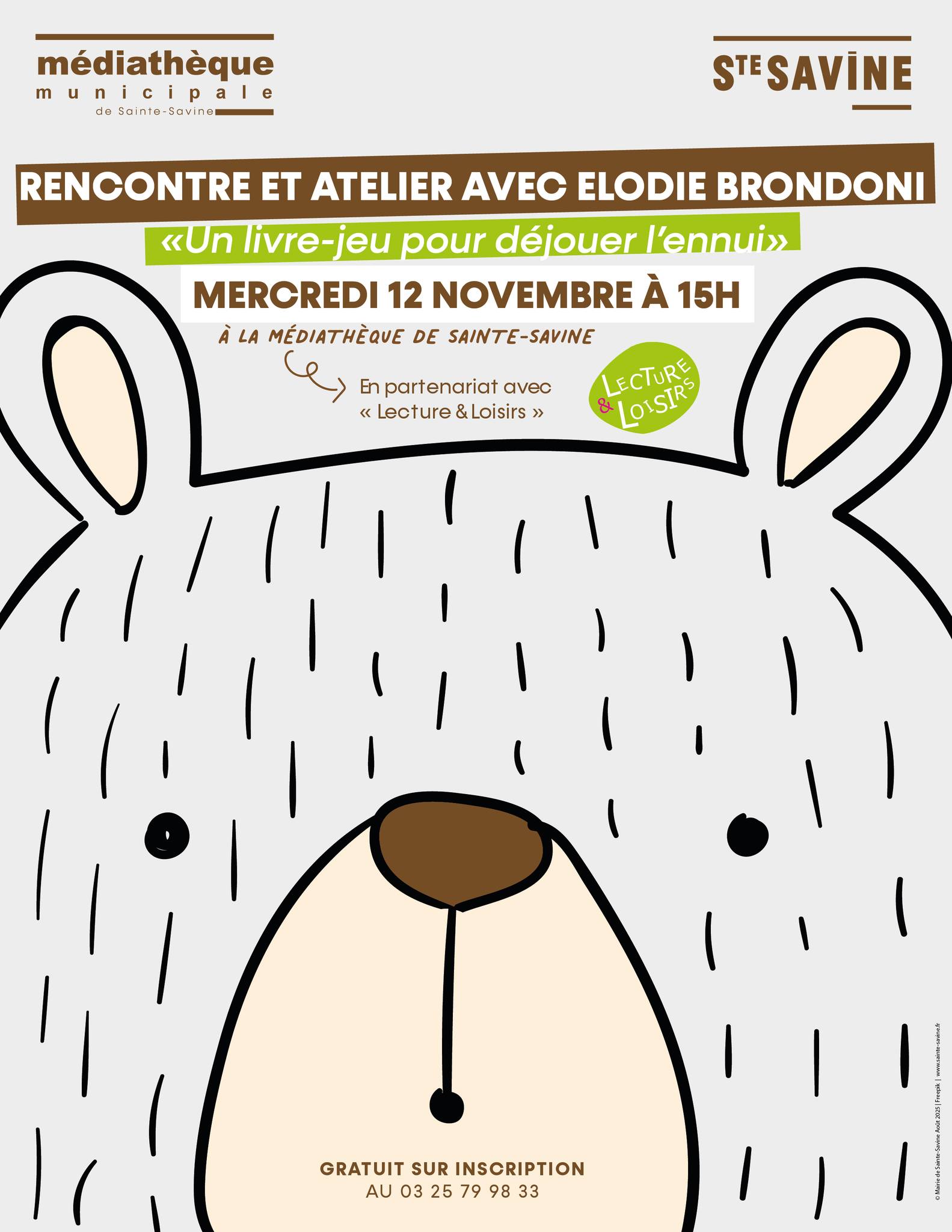 Elodie Brondoni, autrice-illustratrice en résidence de création chez Lecture et Loisirs, proposera aux enfants et parents un atelier « Un livre-jeu pour déjouer l’ennui », le mercredi 12 novembre à 15h à la Médiathèque de Sainte-Savine. Cette rencontre sera suivie d’une dédicace à la librairie La Petite Marchande de Prose.
