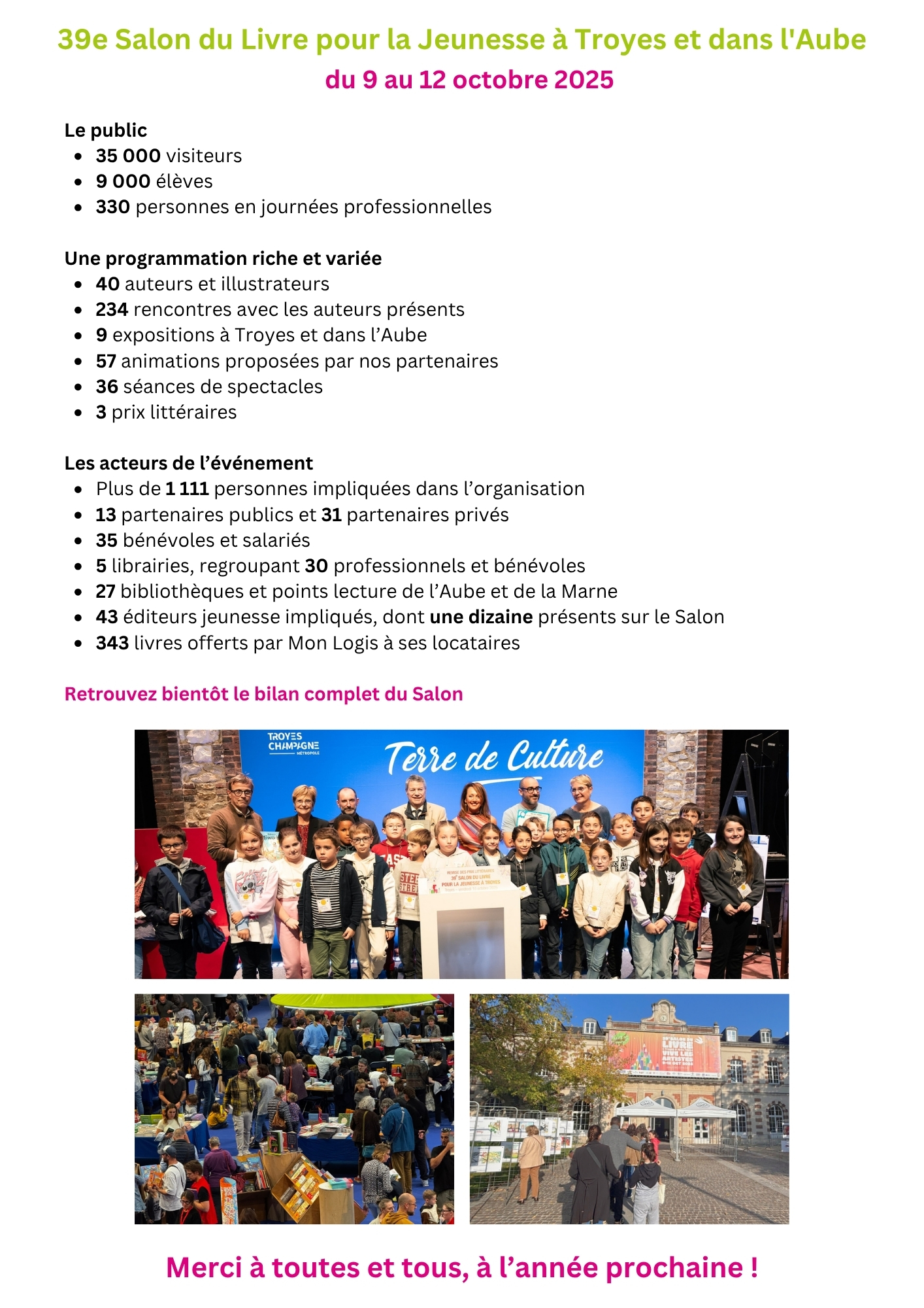 En attendant le bilan détaillé du 39e Salon du Livre, voici les premiers chiffres résumant cette magnifique édition. Un grand merci à nos bénévoles, partenaires et participants pour leur aide et soutien !