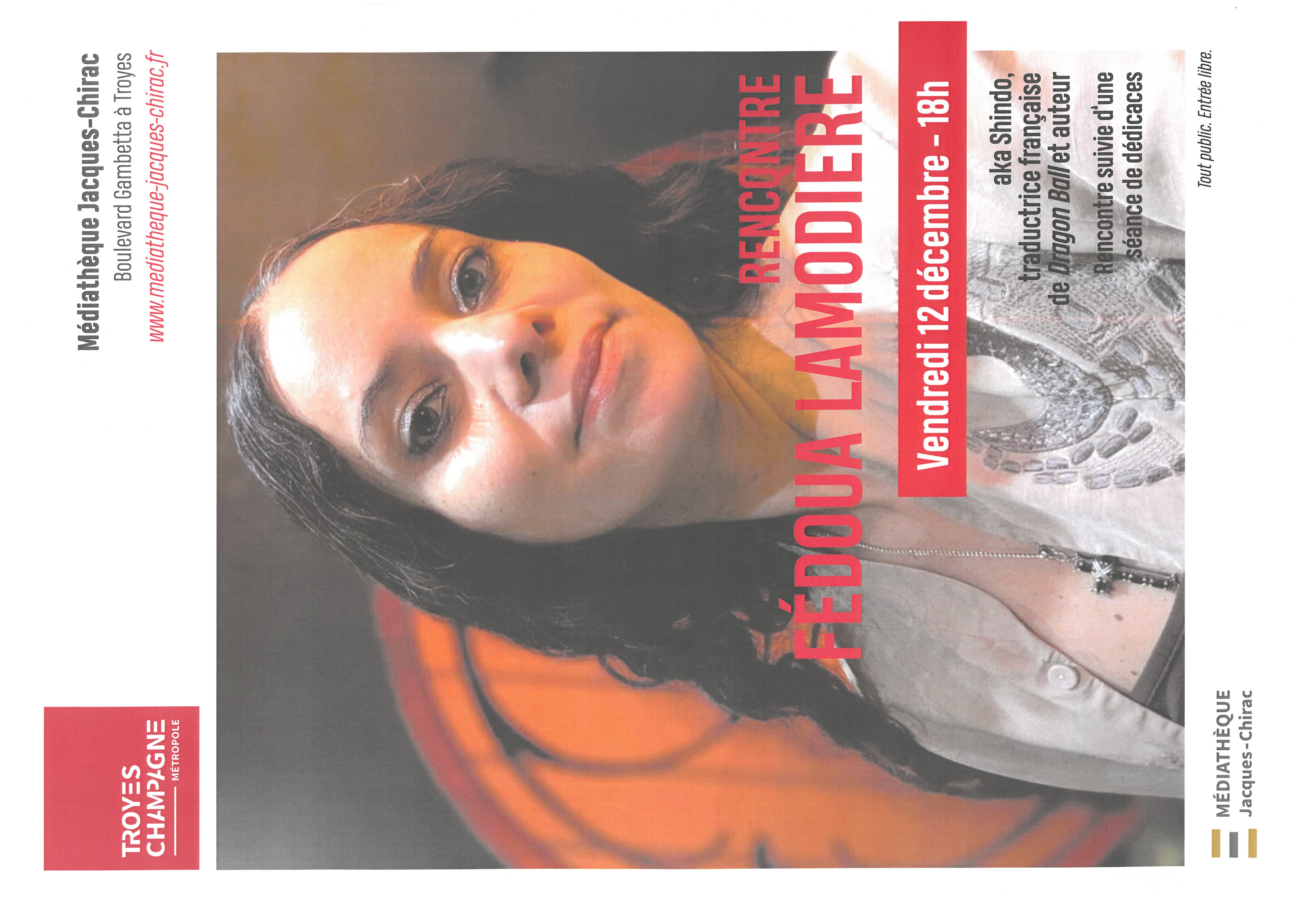 La Médiathèque Jacques-Chirac célèbre sa nouvelle mangathèque en organisant plusieurs événements tout au long du mois de décembre : elle recevra, le 12 et 13 décembre, Fédoua Lamodière, traductrice de nombreux mangas tels que Dragon Ball, Jujutsu Kaizen et Pandora Hearts, et mangaka de Pilgrim, sous le nom de Shindo.